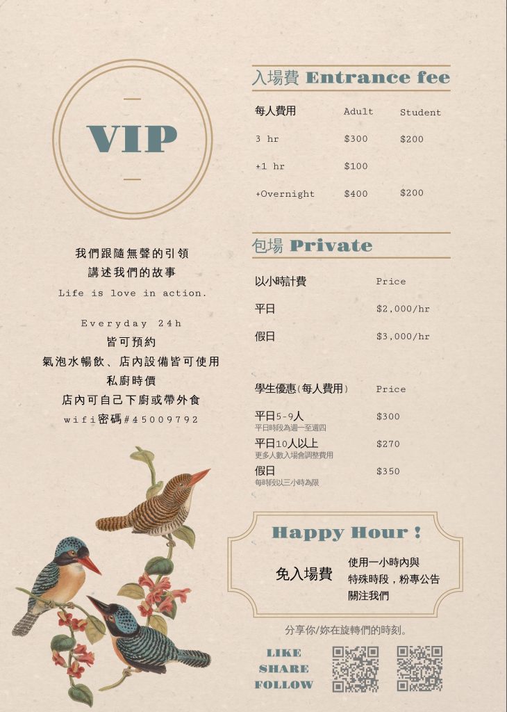 收費簡單,學生入場200元,通宵到隔天+200,共400元整;成人收費入場300元,通宵到隔天+400,共700元整。氣泡水暢飲,其他飲料部分半價,也可自己帶或運用廚房,酌收食材費以及需保持整潔。常客或VIP我們會幫你設門禁,用悠遊卡就能進出,最後一位離開請去確保燈火瓦斯電器冷氣已關閉。