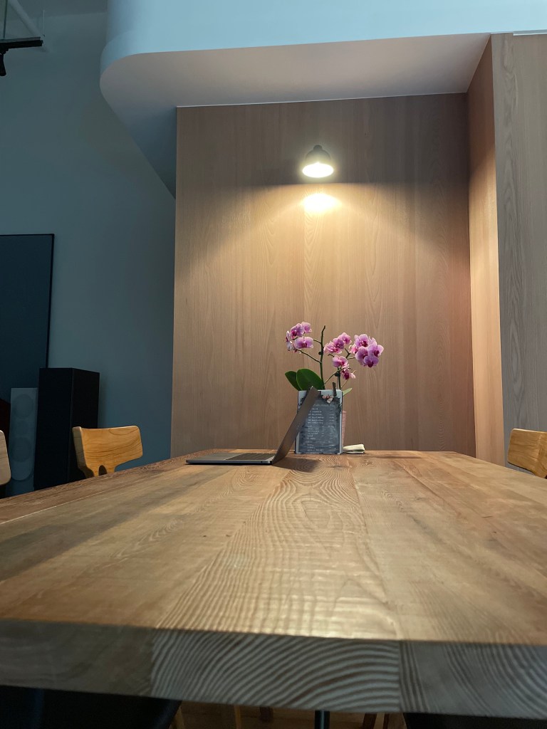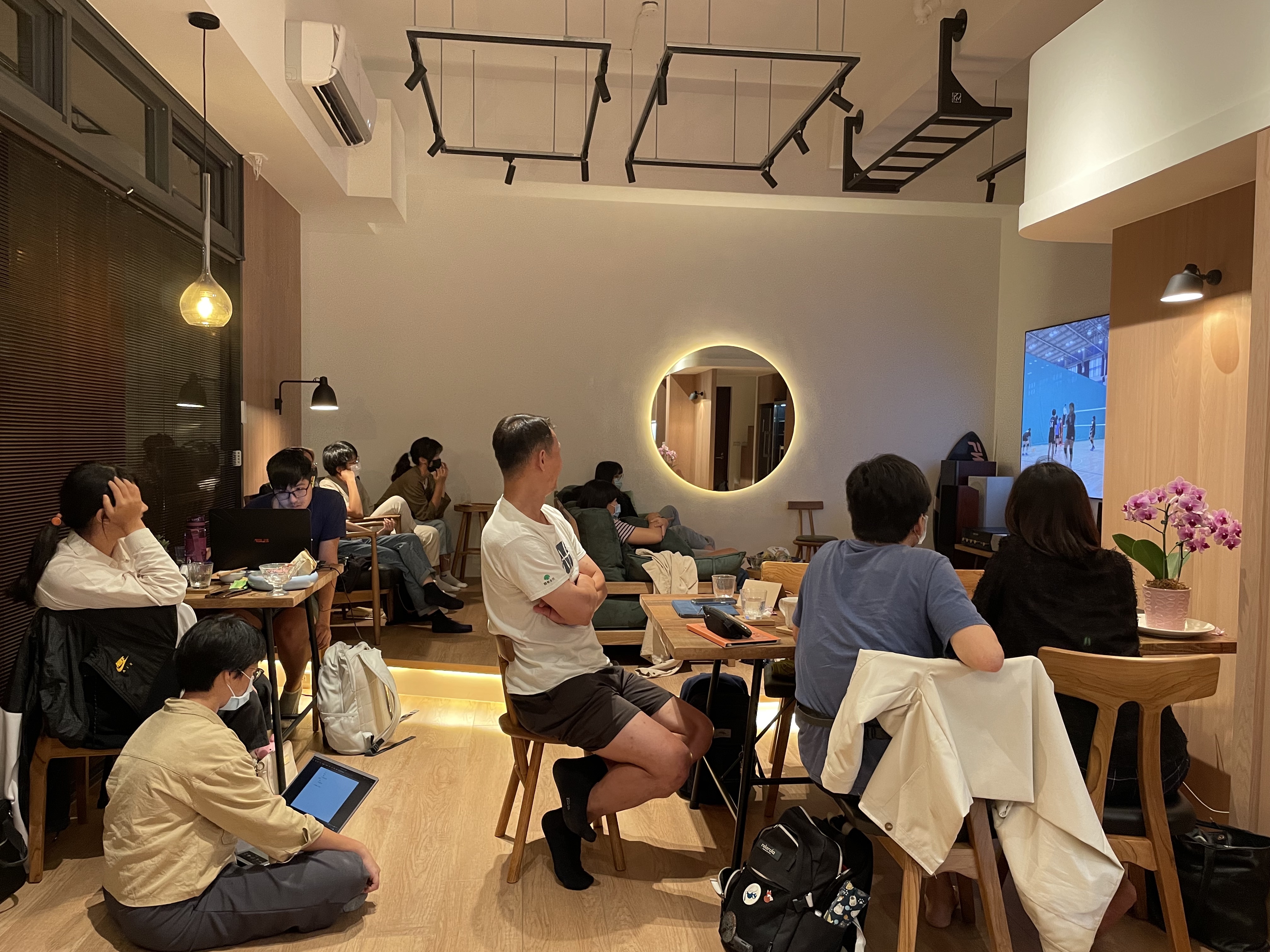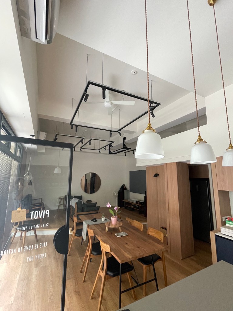 扯遠了,弧形的設計也是走道,靠牆末端有較寬的檯面,有較多的使用面積,用來訓練(躺)以及擺放投影布幕與音響,而最後鞋櫃用意是為了讓弧形收邊,不會突兀的結束,順著走道繼續走,閣樓下方有設計放置酒櫃、冷凍櫃;靠窗初端平台較窄,為了能在桌區的窗邊放張桌子,不當著門口,又讓門口處空間更多,更有流動的感覺。待在在這個空間,流動起來、向上揚升,是這間店的精神。